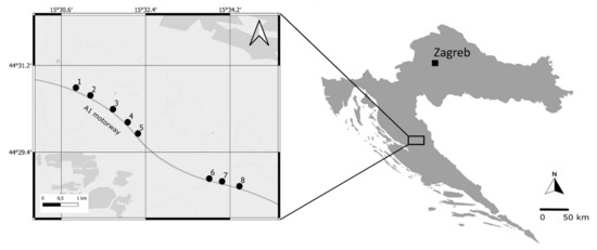 The field study reported in this paper was conducted in 2018 along the A1 motorway (European route E65) in the Ličko polje karst field (44°30′06.2′′ N 15°32′28.3′′ E), Lika-Senj County, Croatia. The climate of this area is temperate humid with warm summers [38], with the average annual air temperature of 8–9 °C and the average annual amount of precipitation between 1300 and 1400 mm [39]. Orthopterans were sampled at eight locations separated by at least 500 m (to ensure the independence of the samples; see e.g., Hochkirch and Adorf [40]) on the northern side of the motorway (Figure 1), within a mosaic of Scorzonerion villosae Horvatić 1949 grasslands and Arrhenatherion elatioris Br.-Bl. 1926 meadows [41]. Certain portions of the habitat are currently undergoing succession to heath with Pteridium aqilinum (L.) Kuhn (Dennstaedtiaceae Lotsy) [41], due to the abandonment of extensive grazing. When choosing sampling locations, we were careful to select as homogeneous, succession-free areas as possible. There was a higher representation of shrubs and ruderal elements, such as Rubus L. spp. (Rosaceae Juss.), Sambucus ebulus L. (Viburnaceae Raf.) and Rumex L. spp. (Polygonaceae Juss.), closer to the motorway (10–20 m distance) at all locations. At each location, we selected five sites at increasing distance from the motorway (to account for the fact that road proximity effects weaken towards habitat interior, see Knapp et al. [42]), i.e., at 10, 25, 50 and 100 m, including a control site at 500 m distance. Altogether, 40 sites were, thus, selected.