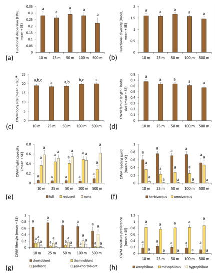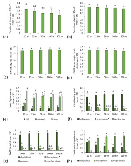 Differences in functional diversity and community weighted mean values of functional traits (mean and standard error) in orthopteran assemblages sampled by pitfall traps at different distances from the motorway: (a) functional dispersion; (b) Rao’s quadratic diversity; (c) body size; (d) hind femur length/body size ratio; (e) flight capacity; (f) feeding guild; (g) lifestyle; (h) moisture preference. Functional trait categories that exhibit significant spatial patterns are marked by asterisks (*). Different letters indicate statistically significant differences among estimated means within each trait category (generalised linear mixed model, least significant difference post hoc test, p < 0.05).