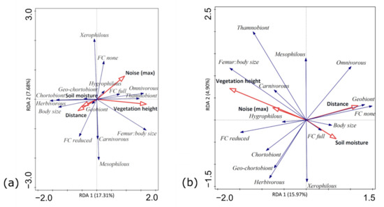 Redundancy analysis (RDA) biplot showing the relationships between functional traits (blue arrows) of orthopterans sampled by (a) sweep-net; (b) pitfall traps and road-influenced environmental factors (red arrows). Abbreviations: FC = flight capacity.