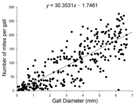 Diameters per gall were positively correlated with the numbers of mites per gall. The numbers with various diameters of galls fitted the linear equation well via linear regression analysis (R2 = 0.662, F1,298 = 583.136, p < 0.001; Figure 1). Using the linear regression gets a rule of one more millimeter on gall diameter for every 30 individuals increase in mite abundance per gall. The mean diameter of galls measured was 3.40 ± 0.11 mm, and the mean density of mites in each gall was 101.32 ± 4.24 individuals.