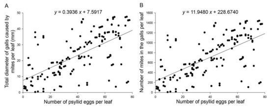 Relationship between A. pallida and B. gobica egg abundances on Goji berry leaves. (A) Relationship between the total diameter of galls and the number of psyllid eggs on a leaf; (B) Relationship between the number of mites in galls and the number of psyllid eggs on a leaf. The line was fitted using linear regression analysis.