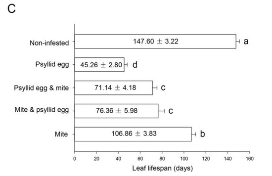 Further, we recorded the defoliation event by measuring the leaf lifespan. Overall, 140 (Mite), 39 (Mite & psyllid egg), 63 (Psyllid egg & mite), 85 (Psyllid egg), and 381 (Non-infested) leaves with different treatments were tested. The lifespan of non-infested leaves was 147.60 ± 3.22 d. By contrast, only mite infestation slightly affected the leaf lifespan (Mite = 106.86 ± 3.83 d). Mite and psyllid infestation treatments (Mite & psyllid egg = 76.36 ± 5.98 d, Psyllid egg & mite = 71.14 ± 4.18 d, regardless of whether mite was first or subsequent species to infest hosts) were characterized by a short lifespan, but still had a longer leaf lifespan than only psyllid infestation treatment (Psyllid egg = 45.26 ± 2.80 d) (F4,703 = 89.962, p < 0.001; Figure 3C).