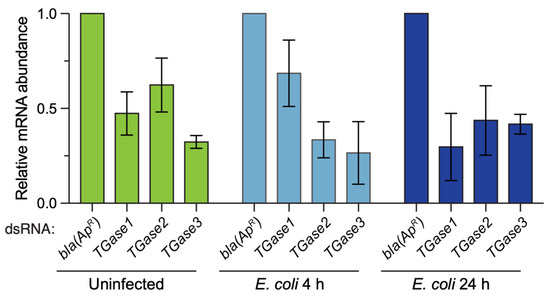 Two-day-old female mosquitoes were divided into four RNAi groups: (i) dsbla(ApR), (ii) dsTGase1, (iii) dsTGase2, and (iv) dsTGase3. Four days later (at 6 days of adulthood), each dsRNA group was divided into two treatment conditions: (i) uninfected and (ii) infected with E. coli. Each infected condition was assayed at 24 h and 4 h after treatment.