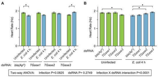 Effect of RNAi-based silencing of TGase1, TGase2 or TGase3 on the heart rate at 24 h after treatment. Graphs show the average heart contraction rates in mosquitoes treated with bla(ApR), TGase1, TGase2 or TGase3 dsRNA, and were either uninfected or infected with E. coli for 24 h. The same data are presented in two configurations: panel (A) groups the data by dsRNA treatment whereas panel (B) groups the data by infection status. Data were analyzed by two-way ANOVA followed by Sidak’s post hoc test. Column heights mark the means, and whiskers show the S.E.M. Asterisks (*) indicate post hoc p < 0.05.