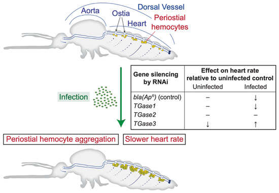 Diagrammatic representation of the mosquito circulatory system and the process of periostial hemocyte aggregation, together with the effect of silencing transglutaminase genes on the heart contraction rate of uninfected and infected mosquitoes.