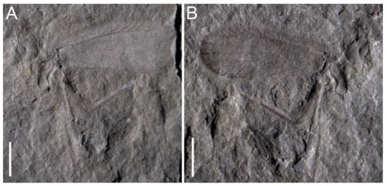 Triassopsyllidiida pectinata gen. et sp. nov., Middle Triassic Tongchuan biota, holotype NIGP180297, photographs of general habitus. (A) part; (B) counterpart. Scale bars: 1 mm.