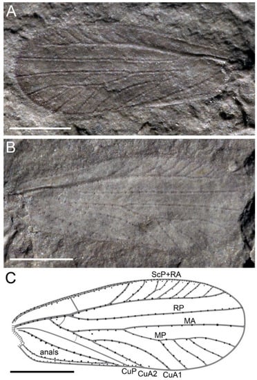 Some other fossil families show similarities with Triassopsyllidiida gen. nov., namely the Liadopsyllidae Martynov, 1926, but these have no strong setae on their veins and their vein M has only two distal branches, unlike Triassopsyllidiida gen. nov. [7,8,9]. The Archescytinidae Tillyard, 1926, and the Pincombeidae Tillyard, 1922, have a simple RP, but their M and CuA separate at their common base on R + M + CuA [10,11]. The Dysmorphoptilidae Handlirsch, 1906, also has a simple RP, or it is weakly forked, and a common stem of M with CuA, but they have a broader area between C and ScP + R and a tegmen that is abruptly narrowed distally. None of these groups have strong macrotrichia on their veins [12,13,14,15].