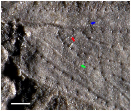 Triassopsyllidiida pectinata gen. et sp. nov., Middle Triassic Tongchuan biota, holotype NIGP180297, photographs of wing base, blue arrow indicating a putative crossvein between ScA and ScP+R, red arrow indicating a putative crossvein between R and M + CuA, and green arrow indicating a possible crossvein cua-cup. Scale bars: 0.2 mm.
