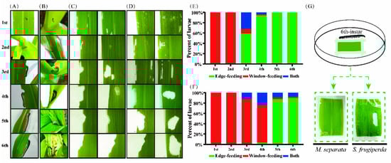 During the vegetative growth stages of maize in the field, new first instars of M. separata and S. frugiperda feed on the leaf surface and then move to whorls. Second to third instars of both pests prefer feeding in whorls. By contrast, fourth to sixth instars of M. separata move out of the whorl and feed from the leaf edge, but older instars of S. frugiperda still feed in the whorl (Figure 1A,B). To analyze why M. separata older instar larvae like feeding from the leaf edge, their abilities of biting and boring leaves were tested. The results showed that first to second instars of both M. separata and S. frugiperda tended to feed from the leaf surface, not from the edge, forming a window-like damage (Figure 1C,D). The feeding behavior of third instars began to differ between the two species. Most of the third to fourth instar M. separata started feeding from the leaf edge, while most of the third to fourth instar S. frugiperda fed from the leaf surface. Interestingly, there were still some fifth to sixth instar S. frugiperda that fed from the leaf surface; however, all fifth to sixth instar M. separata could only feed from the leaf edge (Figure 1E,F). To identify the disability of older instar M. separata feeding from the leaf surface, sixth-instar larvae were reared on corn leaves which were placed inside on the petri dish. The results showed that sixth-instar S. frugiperda fed from the surface, forming a hole in the leaf; however, sixth-instar M. separata could not bore the leaf to form a hole (Figure 1G). Therefore, all instars of S. frugiperda larvae could feed from the leaf surface, while fifth to sixth instar larvae of M. separata could only feed along the leaf edge.