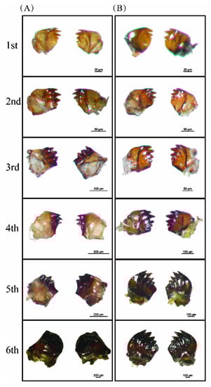 Morphology of larval mandibles of two armyworm species. (A) 1st–6th instar oriental armyworm. (B) 1st–6th instar fall armyworm. Larval mandibles were dissected from mouthparts and photographed.