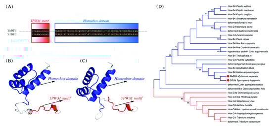 Characterizations of MsDfd and SfDfd. (A) YPWM motif and homeobox domain of MsDfd and SfDfd. Predicted protein structures of MsDfd (B) and SfDfd (C). (D) Phylogenetic tree of Dfds. Dfds marked with a red dot are MsDfd and SfDfd. The phylogenetic tree was built using MEGA 7 with the maximum-likelihood method. Red line represents Dfds from Coleopteran insects and blue line represents Dfds of insects from other orders.