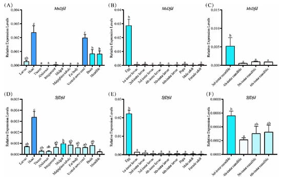 Spatiotemporal expression patterns of MsDfd and SfDfd. (A) MsDfd in different tissues of 4th-instar M. separata. (B) Levels of MsDfd during different developmental stages of M. separata. (C) Expression of MsDfd among mandibles of 3rd–6th instar M. separata. (D) SfDfd in different tissues of 4th-instar S. frugiperda. (E) Levels of SfDfd during different developmental stages of S. frugiperda. (F) Expression of SfDfd among mandibles of 3rd–6th instar S. frugiperda. The 2−ΔCt method was used to calculate the relative gene expression. Three biological replicates were performed for each group. The bars with different colors and different numbers on the columns represent significantly different levels of gene expression (p < 0.05, Duncan’s multiple range test).