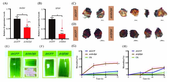 RNAi of Dfds was performed with dsRNA-microinjection for third-instar larvae. As a result, both MsDfd and SfDfd were knocked down in third-instar larvae after injecting dsRNA, with a 43% and 75% decrease at 24 h, respectively (Figure 5A,B). The results showed that fourth-instar larvae molted from dsMsDfd-injected third-instar M. separata had shorter, thinner and flatter mandibles than controls injected with dsGFP (Figure 5C), while dsSfDfd-injected S. frugiperda larvae showed no abnormal mandibles (Figure 5D). For dsMsDfd-injected larvae, it was difficult to feed on the leaf surface to form window damage (Figure 5E), but dsSfDfd-injected larvae could feed from the leaf surface to form a hole as controls (Figure 5F). Moreover, the effects of dsRNA feeding on newly first instar larvae were compared between these two species. Interestingly, M. separata larvae had higher mortalities after feeding with dsMsDfd than controls fed dsGFP for 24, 48, and 72 h, respectively (Figure 5G), while the mortality of S. frugiperda larvae was similar to that of control groups (Figure 5H).