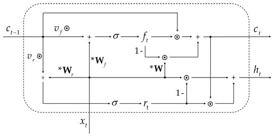 Among them, , , , , , and stand for the forget gate, internal state, reset gate, output state, previous state, and current input, respectively. , , and are parameter matrices; , , , and are parameter vectors that are learnable during training; is the bias term of the forget gate and is the bias term of the reset gate; is the sigmoid function; and ⊙ represents point-wise multiplication. Equations (1) and (2) comprise the light recurrence part, and Equations (3) and (4) comprise the highway network part. Figure 3 demonstrates the structure of SRU.