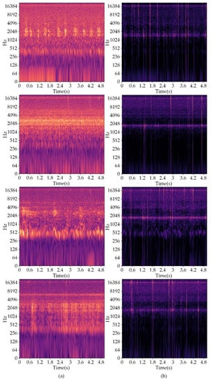 To eliminate the influence of the noise floor, we implemented spectral subtraction [31] in Python and applied it to the recordings. Spectral subtraction requires a segment of the sample as the target. In this case, the sample is a segment of the noise floor. For the boring vibration recordings, a segment of the recording from dead trunk was chosen as the noise floor sample. The noise floor samples used for the environmental noise are relatively quiet segments from the environmental noise. For the sake of easier processing afterwards, we split all recordings into 5 s segments. In the experiment, 94 percent of the data was used for training, and the other 6 percent was used for testing purposes. Thus, 94 percent of the boring vibration segments and environmental noise segments were selected to construct the training set, and the remaining were used to construct the test set. We randomly mixed the boring vibration segments and environmental noise segments at an SNR of −10 for both the training set and test set. Due to hardware limitations, we selected half of the audio clips that contained the most energy [32] as our dataset. As a result, the training set contained 9940 clips, with about 13.8 h of boring vibrations, and the test set contained 632 clips, with about 52.67 min. To minimize the likelihood of model overfitting and selection bias, the audio in the test set was not seen by the model during training.
