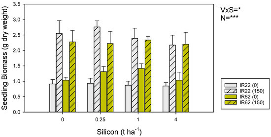Biomass (g dry weight) of IR22 (gray bars) and IR62 (yellow bars) seedlings at 35 DAT. Seedlings were grown in pots with zero added nitrogen (solid bars) and nitrogen equivalent to 150 kg ha−1 (hatched bars). Pots received one of four silicon treatments. Standard errors are shown (sample size = 6). Summary statistics for univariate general linear model are indicated as V × S = variety × silicon level interaction, N = nitrogen, * = p ≤ 0.05, and *** = p ≤ 0.005.