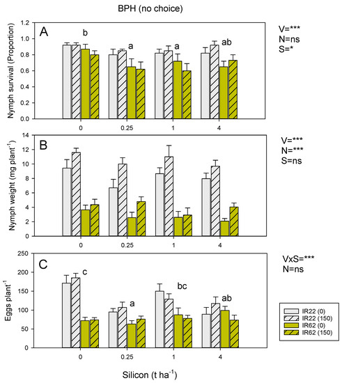 In the choice experiment, more BPH nymphs settled on IR22 plants and plants under high nitrogen (Figure 3A). Soil silicon reduced settling (linear contrast p < 0.001: Figure 3A); however, there was a significant silicon × nitrogen interaction because the effects of silicon were more apparent for plants without added nitrogen. Settling preferences and consequent feeding resulted in variety, nitrogen, and silicon effects on final plant weight; however, the three-way interaction was also significant (Table S5). There was no apparent effect of soil silicon on settling by WBPH nymphs (Table S6) or GLH nymphs (Table S4). Both WBPH and GLH settled less on IR62 plants, and fewer WBPH nymphs settled on low-nitrogen plants compared to high-nitrogen plants (Tables S4 and S6).