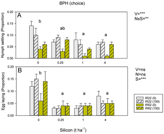 In our experiments, resistance reduced the fitness of BPH nymphs (Figure 2, Figure 3), WBPH nymphs (Tables S3 and S6), and GLH nymphs (Table S4). High nitrogen increased the survival and weight of WBPH (Tables S3 and S6) and GLH (Table S4) nymphs and increased the weight of BPH nymphs (Figure 2B) on both IR22 and IR62. These effects of added nitrogen were not countered by increasing soil silicon levels. Silicon was associated with declining BPH nymph survival regardless of nitrogen levels (Figure 2A); but overall, the effects were weak. Meanwhile, in a choice experiment, silicon effectively reduced BPH nymph settling on both IR22 and IR62, but the effect was only apparent under low nitrogen conditions (Figure 3A), suggesting that silicon was not sufficient to reduce preferential settling on high nitrogen plants—or that high nitrogen had reduced the assimilation of silicon into plant tissues. In a further no-choice experiment, we found that high nitrogen had no apparent effects on egg laying by BPH (Figure 2C); however, in the corresponding choice experiment, more eggs were laid in IR62 plants under high nitrogen, but only in the absence of added silicon (Figure 3B). Wu et al. (2017) [63] found that silicon-induced mortality of adult female BPH actually increased under increasing nitrogen levels, despite higher feeding rates under the same nitrogen conditions. When taken together, these results suggest that high levels of nitrogenous fertilizers will diminish the negative effects of both soil silicon and host resistance on the fitness of planthopper and leafhopper nymphs; but that silicon counters nitrogen-related reductions in rice antixenosis defenses, and possibly antibiosis defenses [63], against gravid females.