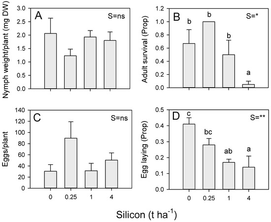 Effects of soil silicon on BPH (A) nymph weights, (B) adult survival and (C) egg laying during no-choice experiments conducted using rice variety IR50404 in Vietnam, and on BPH (D) egg laying during a corresponding choice experiment. Soil was amended with 0, 0.25, 1 and 4 t ha−1 equivalents of silicon. Standard errors are indicated (sample size = 6). Summary statistics for univariate general linear models are indicated as S = silicon, ns = p > 0.05, * = p ≤ 0.05 and ** = p ≤ 0.01; lowercase letters indicate homogenous silicon groups. See also Tables S7 and S8.