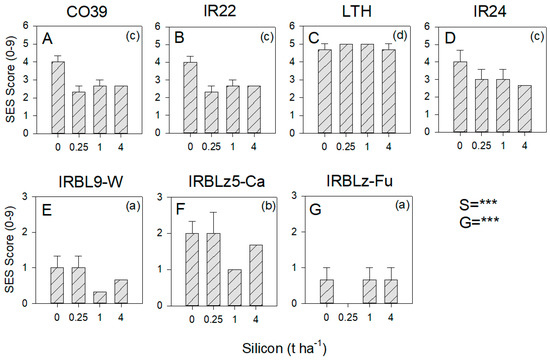 Effects of soil silicon on blast disease in 7 rice varieties: Varieties (A) CO39, (B) IR22, (C) LTH, (D) IR24 were susceptible to blast, whereas varieties (E) IRBL-W, (F) IRBLz5-Ca, and (G) IRBLz-Fu were resistant to blast. Blast incidence was evaluated using the Standard Evaluation System (SES) for leaf blast. Soil was amended with 0, 0.25, 1 and 4 t ha−1 equivalents of silicon. Standard errors are indicated (sample size = 3). Summary statistics for the univariate general linear model are indicated as S = silicon level interaction, G = rice genotype, and *** = p ≤ 0.005; lowercase letters in parentheses indicate homogenous variety groups; note differences in scales. See also Table S9.