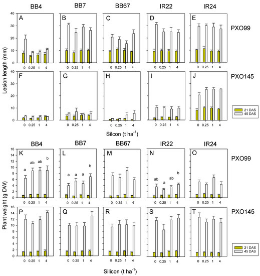 Rice plants at 21 DAS and 45 DAS of five rice genotypes (as described above) were used to test Xoo expression under different levels of soil silicon (Table S1). The plants were all sown at the same time and were evaluated in sequence. Inoculums of the PXO99 and PXO145 isolates were prepared from 3-day-old cultures. Plants were inoculated by the leaf clipping method at 21 DAS (early inoculation) or 45 DAS (late inoculation) using scissors to cut the tips of the leaves after dipping into the corresponding isolate [35]. At 11 (early inoculation) or 14 (late inoculation) days after inoculation (DAI), plants were evaluated by measuring the length of disease lesions using digital calipers on the inoculated leaves. After lesions were measured, the plants were destructively sampled by carefully pulling the plants from the soil (keeping the roots intact). The roots were washed under gently running water, and the plants placed in paper bags and dried in a forced draught oven at 60 °C for 7 days. After drying, the plants were weighted on a precision balance to estimate dry weight.