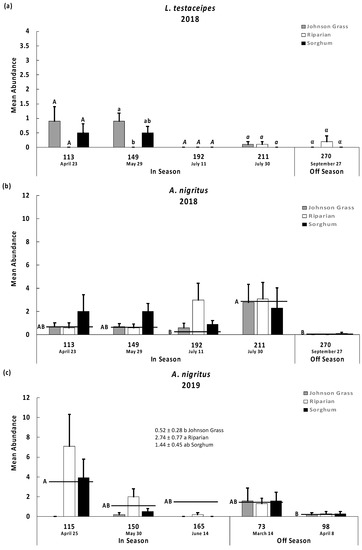 Recoveries (mean abundance per pot are bars and SEM are lines extending from bars) of two parasitoids: (a) Lysiphlebus testaceipes in 2018, (b) Aphelinus nigritus in 2018, and (c) A. nigritus in 2019) in three habitat sites (Johnson Grass pure stand, Riparian area including Johnson Grass, and Sorghum field) during selected dates when sorghum was in cultivation (In Season) and out of cultivation (Off Season). Recoveries were taken from pots planted with sorghum and infested with M. sorghi. For. L. testaceipes in 2018, means among the three habitats were compared separately for each date of collection. For A. nigritus in 2018, means for each date were averaged across the habitats and compared based on ANOVA results presented in text. For A. nigritus in 2019, means for each habitat were averaged across the dates of collection and compared. Tukey’s means separation test was used for the comparisons. Means sharing a common symbol (separate comparisons per the ANOVA were indicated by uppercase, lowercase, italics, and Greek lettering) did not significantly differ. Comparisons for L. testaceipes were not conducted in 2019 due to lack of significant ANOVA results and low recovery. Please note the change in scale for the y-axis.