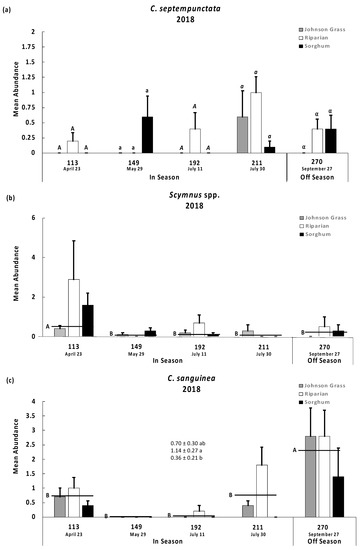 Recoveries (mean abundance per pot are bars and SEM are lines extending from bars) of three predators: (a) Coccinella septempunctata, (b) Scymnus spp., and (c) Cycloneda sanguinea, in three habitat sites (Johnson Grass pure stand, Riparian area including Johnson Grass, and Sorghum field) during selected dates when sorghum was in cultivation (In Season) and out of cultivation (Off Season). Recoveries were taken from pots planted with sorghum and infested with M. sorghi. For C. septempunctata in 2018, means among the three habitats were compared separately for each date of collection. For Scymnus spp. in 2018, means for each date were averaged across the habitats and compared. For C. sanguinea in 2018, means for each habitat were averaged across the dates of collection and compared based on ANOVA results presented in text. Tukey’s means separation test was used for the comparisons. Means sharing a common symbol (separate comparisons per the ANOVA were indicated by uppercase, lowercase, italics, and Greek lettering) did not significantly differ. Comparisons for these predators were not conducted in 2019 due to lack of significant ANOVA results or low predator recoveries. Please note the change in scale for the y-axis.