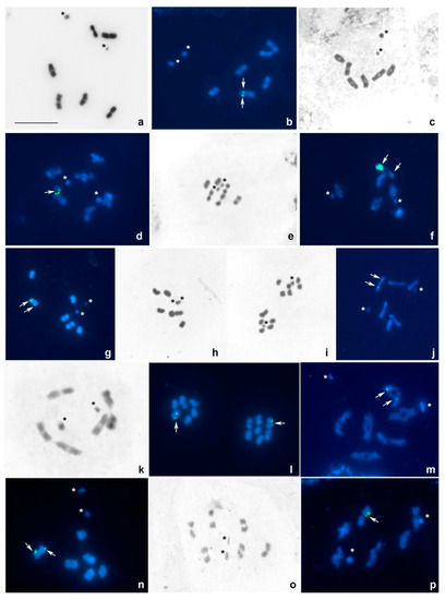 (a–p). Meiotic karyotypes of Tingini species after conventional staining and double FISH using 18S rDNA and telomeric TTAGG as probes. (a) Agramma blandulum, MI; (b) Agramma minutum, MI; (c) Copium adumbratum, MI; (d,e) Copium brevicorne, MI (d), diakinesis (e); (f) Copium clavicorne, diakinesis; (g–i) Corythucha arcuata, MI (g,h), MII (i); (j) Corythucha ciliata, MI; (k,l) Galeatus affinis, MI (k), MII (l); (m) Physatocheila putshkovi, diakinesis; (n) Physatocheila smreczynskii, MI; (o) Stephanitis oschanini, MI; (p) Tingis brevicornis, early metaphase I. Sex chromosomes are marked by asterisks; 18S rDNA signals are shown by arrows; TTAGG signals are absent. Bar = 10 mkm.