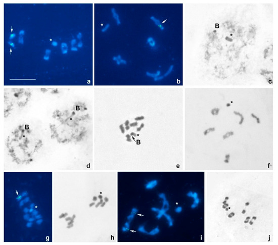 (a–j). Meiotic karyotypes of Acalyptaini species after conventional staining and double FISH using 18S rDNA and telomeric (TTAGG)n as probes. (a) Acalypta gracilis, MI; (b–e) Acalypta hellenica, diakinesis (b), diffuse stage (c), diplotene (d), MI (e); (f–h) Derephysia (Paraderephysia) cristata, diakinesis (f), MI (g), MII (h); (i,j) Kalama beckeri, MI (i), diakinesis (j). Sex chromosomes are marked by asterisks; B—B-chromosome; 18S rDNA-FISH signals are shown by arrows; TTAGG signals are absent. Bar = 10 mkm.