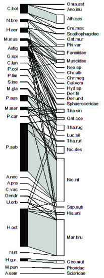 - Schwarz, H.H.; Starrach, M.; Koulianos, S. Host Specificity and Permanence of Associations between Mesostigmatic Mites (Acari: Anactinotrichida) and Burying Beetles (Coleoptera: Silphidae: Nicrophorus). J. Nat. Hist. 1998, 32, 159–172. [Google Scholar] [CrossRef]