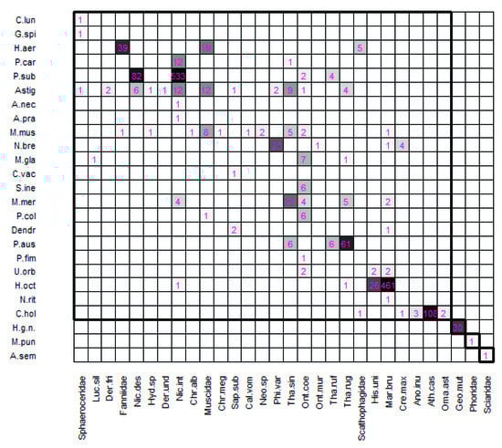 - It is composed of 1 shared compartment and 3 individual compartments. Each compartment is a subset formed by species of mites and insects that interact with each other, sharing species reciprocally, and that do not occur with the rest of the subsets. The first compartment is composed of 21 species of Mesostigmata, plus the order Astigmata, and 27 species of insects hosting more than one species. The second, third, and fourth compartments are individual compartments formed by a single mite species and a single host insect: Halolaelapidae sp. with Geotrupes (G.) mutator, Macrocheles punctoscutatus with Phoridae, and A. semiscissus with family Sciaridae (Figure 1).