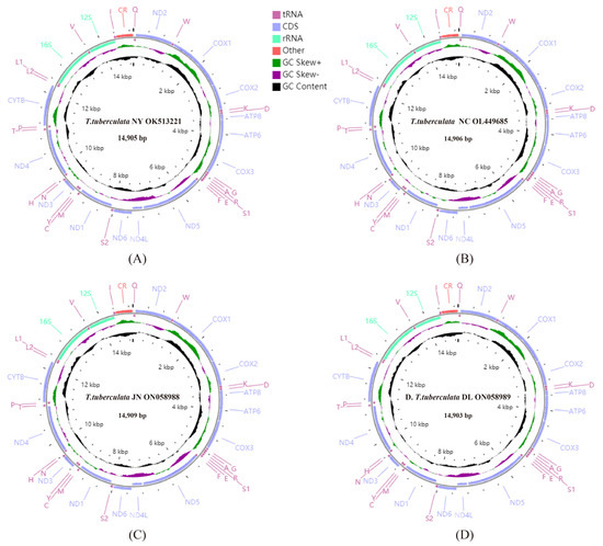 Mitochondrial genome maps of T. tuberculata NY (A), T. tuberculata NC (B), T. tuberculata JN (C), and T. tuberculata DL (D). The first circle shows the gene map (PCGs, rRNAs, tRNAs, and the AT-rich region). The genes shown outside the map are coded on the majority strand (J strand), whereas the genes inside the map are coded on the minority strand (N strand). The second circle shows the GC skew, and the third shows the GC content. GC content and GC skew are plotted as the deviation from the average value of the entire sequence.