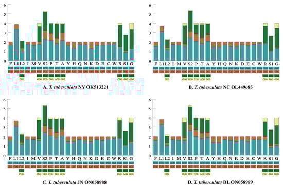 Nine PCGs (ND2, COX1, COX2, ATP8, ATP6, COX3, ND6, ND3, and Cyt b) of four mitochondrial genomes were encoded on the J strand, whereas the residual four PCGs (ND5, ND4L, ND1, ND4) were encoded on the N strand (Table S2). The total sizes of the 13 PCGs of T. tuberculata NY, T. tuberculata NC, T. tuberculata JN, and T. tuberculata DL were 11,079, 11,082, 11,082, and 11,088 bp, respectively (Table 3). For the thirteen PCGs, the A + T content was 71.1, 70.9, 70.8 and 70.0% in T. tuberculata NY, T. tuberculata NC, T. tuberculata JN, and T. tuberculata DL, respectively. The nucleotide skews were positive for AT and negative for GC in four mitochondrial genomes. The shortest PCG was the ATP8 (156 bp) in the four mitochondrial genomes, whereas the longest PCG was the ND5 with 1713 bp in T. tuberculata NY, 1717 bp in T. tuberculata NC, T. tuberculata JN, and 1716 bp in T. tuberculata DL, respectively.