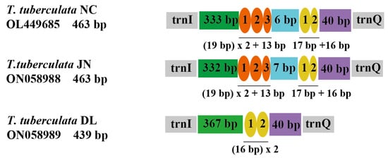 The following are available online at https://www.mdpi.com/article/10.3390/insects13070620/s1, Figure S1: Inferred secondary structures of the tRNA genes in T. tuberculata NY (A), T. tuberculata NC (B), T. tuberculata JN (C), and T. tuberculata DL (D). Table S1: The partition schemes and best-fitting models were selected. Table S2: Location of features in the mitochondrial genomes of the T. tuberculata from four localities. Table S3: Statistics of tandem repeats in the control regions of T. tuberculata NC, T. tuberculata JN, and T. tuberculata DL.
