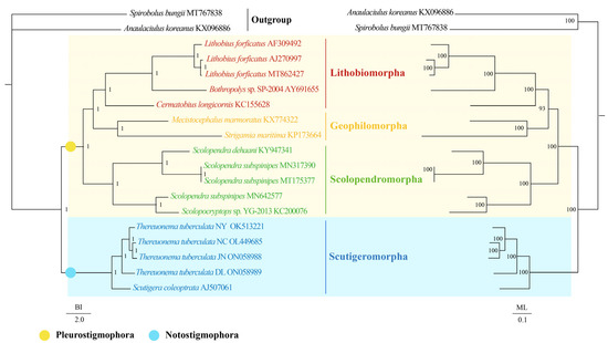 To date, the only mitochondrial genome of Chilopoda, Scutigera coleoptrata [56], was public in the NCBI. In this study, the mitochondrial genomes of 17 chilopods including T. tuberculata, S. coleoptrata [56], two Geophilomorpha species [57], four Scolopendromorpha species [58,59] as well as three Lithobiomorphas species [60,61,62] were selected as the ingroup taxa in order to investigate the phylogenetic relationships within Chilopoda. Since the diplopod was considered as a more distant and suitable outgroup to root the centipede tree [8,11], Anaulaciulus koreanus (Helminthomorpha: Julidae) [63] and Spirobolus bungii (Helminthomorpha: Spirobolidae) (MT767838) were chosen as the outgroup taxa for phylogenetic analyses. The information on all mitochondrial genomes in this study were listed in Table 2.