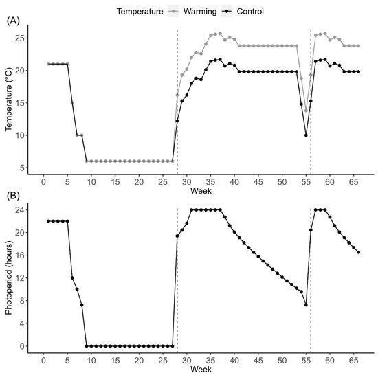 (A) Temperatures in °C and (B) photoperiods in hours of light during a 24 h cycle used during the experiment. Temperature treatment groups differed by 4 °C. The photoperiod was kept identical in both temperature treatments. The first growth season lasted from week 1 to week 8. The second growth season lasted from week 28 to week 55 (start is indicated by a dashed line to the left). The third growth season lasted from week 56 to week 66 (start is indicated by a dashed line to the right). During weeks 9 to 27 we installed winter conditions at 6 °C and total darkness. The short-term temperature and photoperiod drop at week 55 simulated the second winter condition.