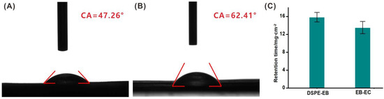 Contact angle of DSPE-EB nanoparticles (A) and EB-EC (B) on the surface of maize foliage; (C) the retention of the DSPE-EB nanoparticles and EB-EC solutions on maize leaves.