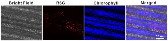 R6G was chosen as a fluorescent dye for analysis of the adhesion behavior of the DSPE-EB nanoparticles on maize foliage by CLSM. As shown in Figure 3, after flushing with deionized water, the red fluorescent signal of R6G also was detected clearly in maize foliage, indicating a good affinity. This could be attributed to the amine groups on the surface of the DSPE-EB nanoparticles that interacted with the maize leaves through covalent bonding and electrostatic attraction [40].