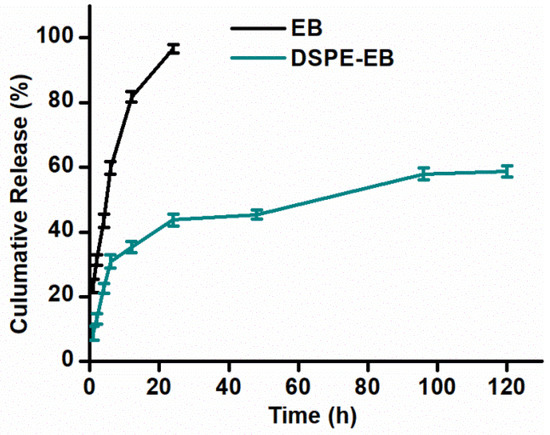 The release profile measurements for EB from DSPE-EB nanoparticles were performed by a dialysis method [37]. The EB and DSPE-EB nanoparticles were placed into dialysis bags with a molecular weight cutoff at 3500 Da (Beijing Solarbio Science & Technology Co., Ltd., Beijing, China) and dialyzed against 45 mL of 40% (v/v) ethanol aqueous solution at 25 °C. At designated time intervals, 1 mL of the release medium was removed and replaced with an equivalent amount of 40% (v/v) ethanol aqueous solution. The concentrations of EB in the collected samples were analyzed by a UV–vis spectrometer.