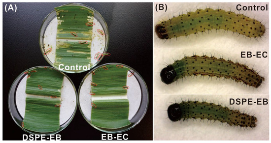 First, we tested the insecticidal activity of free carrier DSPE-PEG2000-NH2; it showed no toxicity toward S. frugiperda even at concentrations up to 1 mg/mL, indicating that it can be used as a suitable carrier for pesticide delivery. Then, the insecticidal efficiencies of the DSPE-EB nanoparticles and EB-EC were explored. As shown in Figure 5A, S. frugiperda was fed with the untreated maize leaves, and all insects were alive after 24 h. S. frugiperda was fed with the DSPE-EB nanoparticles and EB-EC, and the remaining blade area was larger than that in the control group, suggesting that the toxicity of EB loaded in the DSPE-EB nanoparticles was preserved. However, the insects that were fed 0.2 mg/L DSPE-EB nanoparticles and EB-EC treated leaves all died after the same time period. Figure 5B shows the length and growth of S. frugiperda, compared with the control sample, was slowed when fed the DSPE-EB nanoparticles and EB-EC treated leaves, and the tails of S. frugiperda were more likely to shrink and became black, showing signs of poisoning.