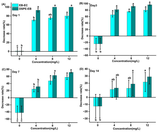 Decrease rates of different concentrations of EB-EC and DSPE-EB nanoparticles against S. furgiperda larvae at 1 (A), 3 (B), 7 (C), and 14 d (D) after spraying under field conditions. Different letters at each data indicate significant differences according to Duncan’s multiple range test at p < 0.05. In all the above data, the error bars represent the standard errors of the means of three replicates.