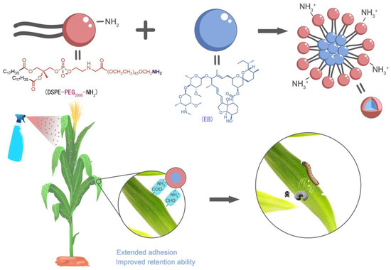 A good retention ability of pesticides can improve their bioavailability. The retention of the DSPE-EB nanoparticles and EB-EC solutions on the maize leaves were measured (refer to Section 2.6 for the experimental procedure). The retention of the DSPE-EB nanoparticles was measured to be 15.85 mg/cm−2 and was higher than that of EB-EC solution (13.52 mg/cm−2), as shown in Figure 2C. This may be because PEG is a long-chain polymer that helps to prevent droplet breakage and to reduce losses.