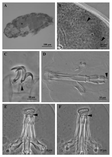 Macrobiotus kyoukenus sp. nov. (A) In toto and in vivo female specimen, asterisk denotes an egg; (B) Cuticular pores (arrowheads) after orcein staining; (C) Claws of the second pair of legs with lunules (arrowhead); (D) Buccal pharyngeal apparatus with two macroplacoids and one microplacoid (arrowhead); (E) Dorsal transversal crests of the buccal armature (arrowhead); (F) Ventral transversal crests of the buccal armature (arrowhead). (A–C,E,F) PhC; (D) DIC.