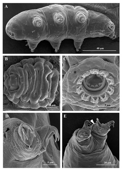 - Biserova, N.M.; Kuznetsova, K.G. Head sensory organs of Halobiotus stenostomus (Eutardigrada, Hypsibiidae). Biol. Bull. 2012, 39, 579–589. [Google Scholar] [CrossRef]