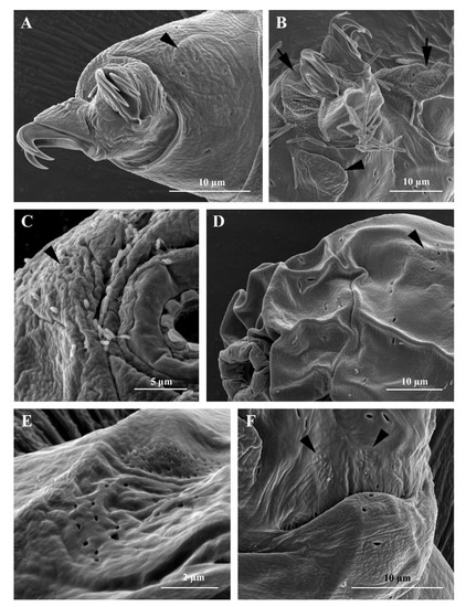 Body: white-yellowish, from 107.0 to 395.9 µm in length (Figure 1A). Eye-spots present (Figure 1A). Smooth cuticle, with oval pores of different size (0.4 to 2.0 µm in longer diameter; Figure 1B and Figure 2A), randomly distributed on all body surface (Figure 1B). Larger pores with an internal granulation (Figure 2D). First three pairs of legs ornamented on the external side with a patch of fine cuticular granules (not always visible with LM), composed by small cones (visible only with SEM; Figure 2D), within this patch a large pore is present (Figure 2D). Posterior and lateral sides of hind legs covered with larger granules (Figure 2E). A flat bulge present on the internal side of the three anterior legs and on the external side of each hind leg (with very small pores on its surface, visible only with SEM; Figure 3A,B). With SEM, areas with small pores present on each side of the mouth (Figure 3C), of the head (Figure 3D,E), and close to the cloaca (Figure 3F), corresponding to the “antero-lateral”, “postero-lateral”, and “cloaca” sensory fields, respectively (see Discussion).