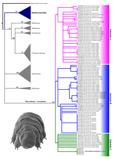 Maximum likelihood phylogenetic tree based on 3659 bp of the 18S and 28S rRNA genes in specimens pertaining to the superfamily Macrobiotoidea. Values in bold denote bootstrap values. All nodes with bootstrap <70% are collapsed. Specimens newly analysed for the present paper are shown in bold; (lower left) In toto specimen of M. kyoukenus sp. nov. (SEM).