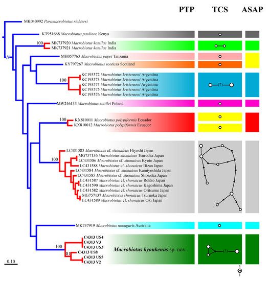 The cox1 dataset is the most complete and informative for species delimitation investigation. Therefore, a phylogenetic tree computed with the maximum likelihood method of the Macrobiotus specimens pertaining to the subclade C (sensu [29]) was utilized for the PTP analysis (Figure 6, left), showing 10 putative species clusters: M. paulinae, M. kamilae, M. papei, M. scoticus, M. kristenseni, M. sottilei, M. polypiformis, M. shonaicus, M. noongaris, and all specimens identified as M. kyoukenus sp. nov. This subdivision is validated by both the haplotype network and the ASAP analyses (Figure 6, centre and right, respectively), with minor discordances involving only M. polypiformis, M. papei, and M. scoticus specimens. Present molecular data therefore confirms the validity of the erection of M. kyoukenus sp. nov.