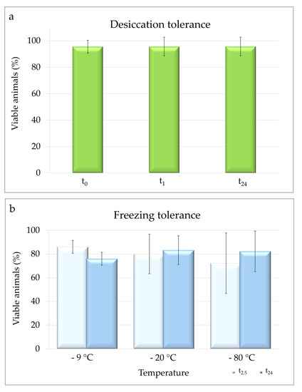 Desiccation and freezing tolerance of M. kyoukenus sp. nov. (a) Percentage of viable animals immediately after rehydration (t0), after 1 h (t1) and 24 h (t24; final survival); (b) Percentage of viable animals at 2.5 h (t2.5) post thawing and after 24 h (t24; final survival) at different freezing temperature (−9, −20 and −80 °C). Each column represents the mean value of six replicates and the bar on each column represents the standard deviation.