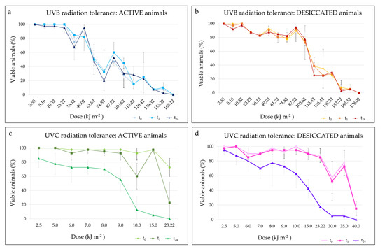 UVB and UVC tolerance of M. kyoukenus sp. nov.: percentage of viable animals after exposure to increasing doses of UV radiation; (a) Active animals after exposition to UVB radiation. (b) Desiccated animals after exposition to UVB radiation; (c) Active animals after exposition to UVC radiation; (d) Desiccated animals after exposition to UVC radiation. (a,c) The locomotion performances of animals evaluated immediately after the end of the irradiation (t0), after 1 h (t1) and 24 h (t24) are reported. (b,d) The locomotion performances of animals evaluated after the end of rehydration (t0), after 1 h (t1) and 24 h (t24) are reported. (a–d) For each tested UV dose, the mean percentage of viable animals and its standard deviation are shown.