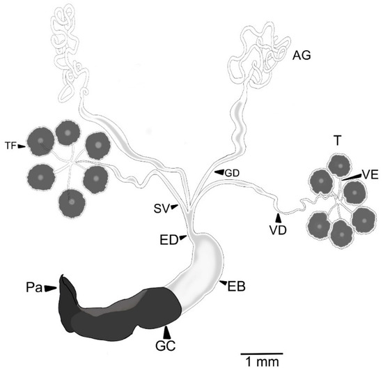 The male RA consists of two accessory glands; two glandular ducts; two testes, each with six follicles; six vasa efferentia; two vasa deferentia; two seminal vesicles; one ejaculatory duct; one ejaculatory bulb; one genital capsule; and one aedeagus (Figure 1). The accessory glands are long ducts with thick walls. The distal portion is long and narrow, and secretion is not observed in its lumen. The proximal portion is thicker and showed luminal secretion. The subsequent zone is thick with a fluid. The accessory glands are connected to the distal end of the ejaculatory duct (Figure 1). Each testis is composed of six free follicles, lobed, dorsoventrally flattened, in form of a “flower”, and every testis follicle is connected to vasa efferentia. The vasa efferentia are short and thin ducts connected to one vasa deferentia.